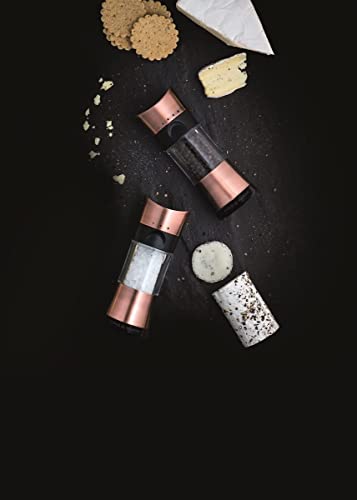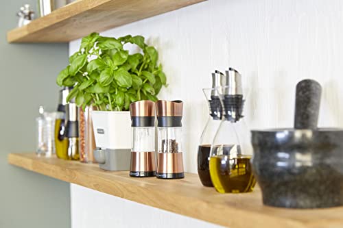 Un moderno ed elegante set di macina sale e pepe Inverta con finitura ramata. Niente più disordine sui piani di lavoro con il meccanismo in cima al mulino.