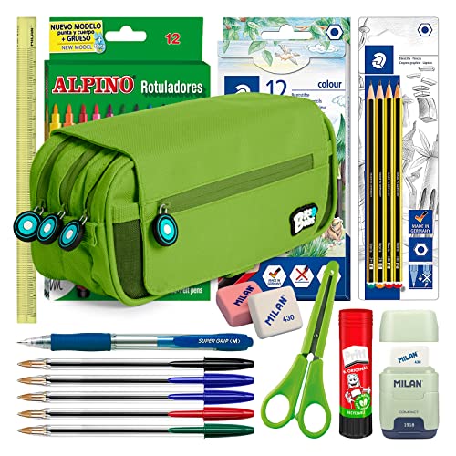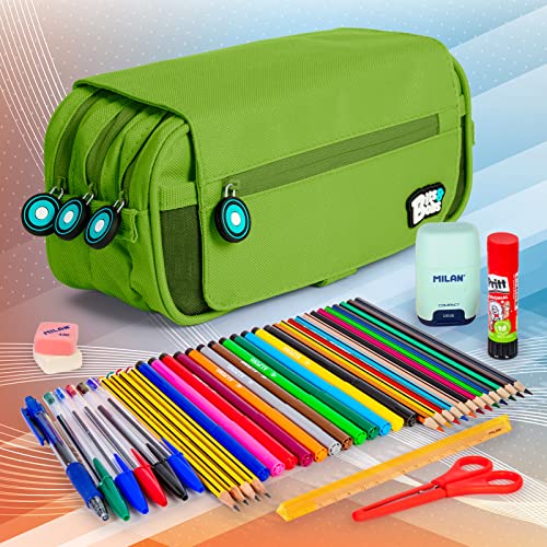 ColePack BitsBobs - Set di Astuccio Scolastico Triplo con 3 Cerniere e Materiale Scolastico delle Migliori Marche Incluso (Green)