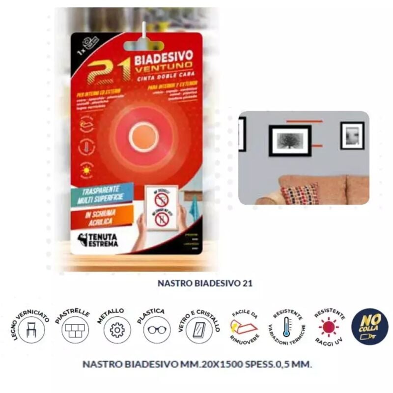 NASTRO BIADESIVO 21 NASTRO BIADESIVO TRASPARENTE IN SCHIUMA ACRILICA DA MT. 1,50, LARGO 20 MM. E SPESSO 1,0 MM. Nastro biadesivo facilmente removibile. Una volta rimosso non lascia tracce. Trasparente. Tenuta estrema. Per uso interno ed esterno. Resistente a vibrazioni ed urti. Ottimo anche su superfici irregolari. Compensa dilatazioni e deformazioni causate da variazioni termiche. OTTIMA ADESIONE su: -vetro -pietre dure -piastrelle -metalli e leghe metalliche -plastiche compresi PVC,PP,PE,NYLON -materiali compositi -legno verniciato. RESISTENTE a: -acqua -oli -solventi -detergenti -plastificanti -raggi uv SOSTITUISCE CHIODI, VITI E TASSELLI.
