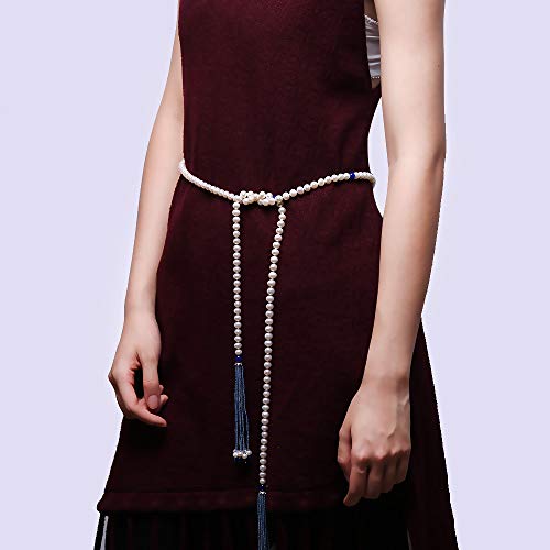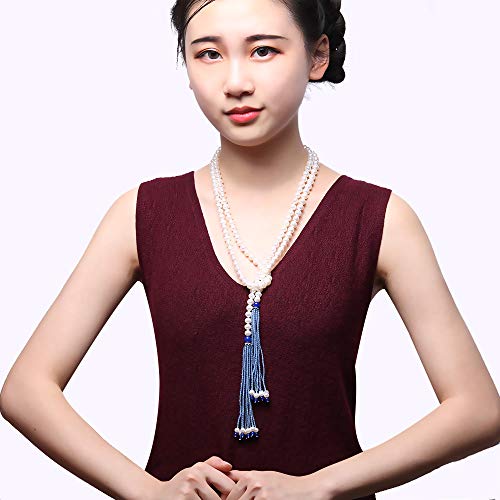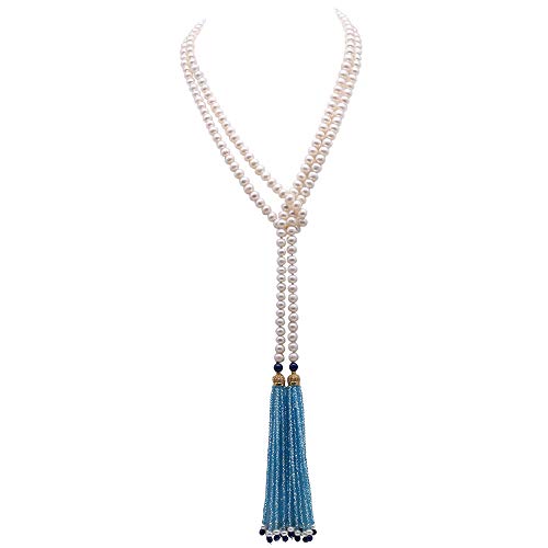 JYX Collana di perle 7-8 mm piatte, rotonde, bianche coltivate di perle d'acqua dolce, con nappa di cristallo, lunghezza 59" e No, colore: Blu, cod. FNO896