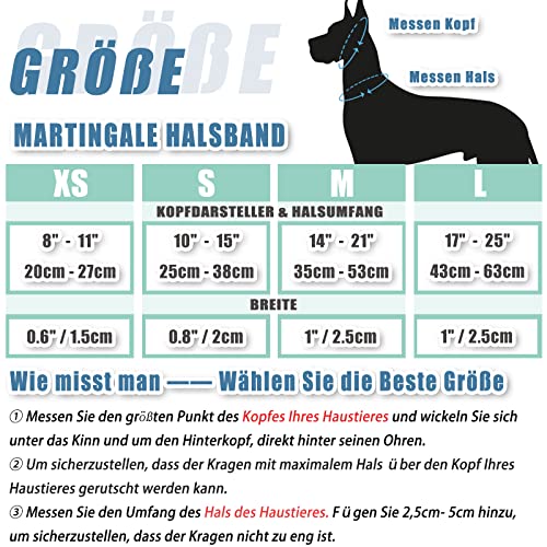 【Regolabile e Scegli le Dimensioni Migliori】- ① Collare per cani Martingale ha una fibbia regolabile, ma non si estende. Si prega di prendere le misure sulla testa e sul collo nella tabella delle dimensioni. ② Collare per cani Martingale non ha fibbia. Ti consigliamo di tenere conto della dimensione della testa del cane prima di selezionare una dimensione di come questo colletto scivola sopra la testa. ③ La dimensione successiva può essere adatta a una testa più grande.
