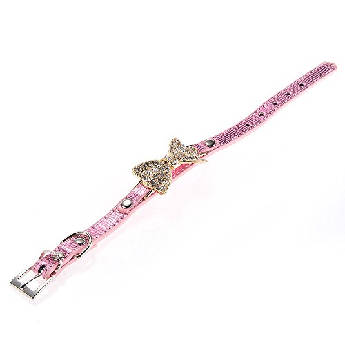 Collare Regolabile in PU Cuoio Rosa con Fiocco Strass per Cani Gatti 1,5x37cm