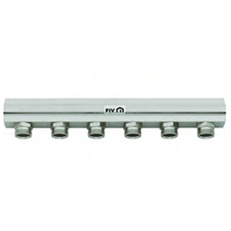 Collettore di distribuzione nichelato da 1 completo di raccordi di derivazione 24x19, con foro superiore per valvola di sfiato. Interasse derivazioni 50 mm. GP2750 CONTROLLER. Denominazione Collettore Materiale UNI EN 12168 CW614N.(DianFlex)Misura: 1 x 5 Vie L. 264 mm