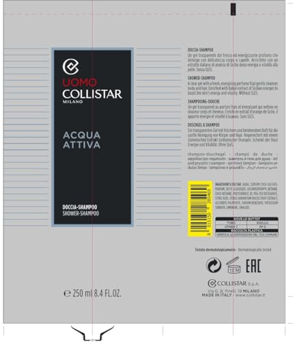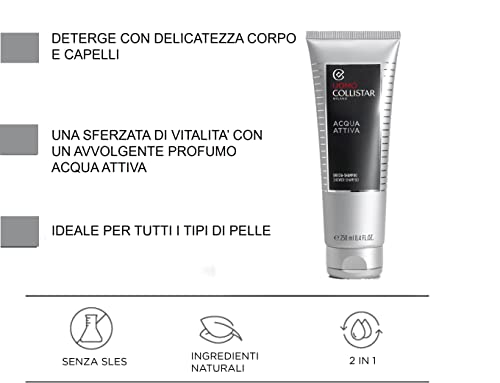 Collistar Acqua Attiva Doccia Shampoo Uomo, Deterge corpo e capelli, Dona nutrimento e idratazione, senza SLES, 250ml
