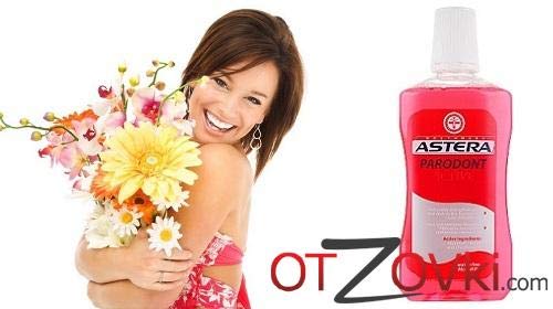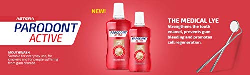Risciacquare quotidianamente con collutorio Astera Parodont Active a base di lattato di alluminio e hlorkesidin per denti sani e gengive.