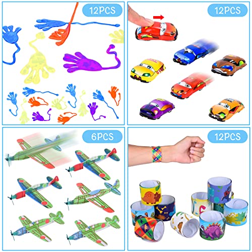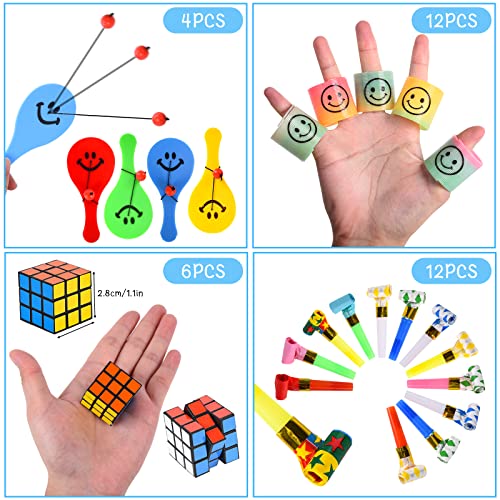 【Contenuto dettagliato del pacchetto】12 macchinine, 12 cerchi arcobaleno, 12 fischietti, 12 mani appiccicose, 10 braccialetti a scatto, 6 adesivi dei cartoni animati, 6 mini cubi di Rubik, 6 piccoli alianti, 4 racchette da paddle. Ogni giocattolo qui è abbastanza divertente!