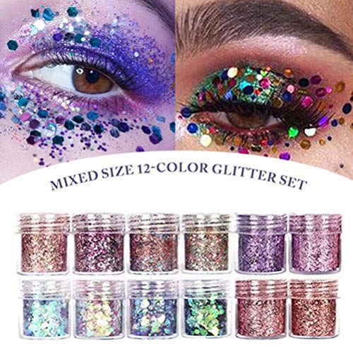 12 colori Face Glitter Cosmetic Glitter Reflective Holographic Chunky Glitter Halloween Glitter per viso Corpo Capelli Nails Festival e Party Beauty Makeup