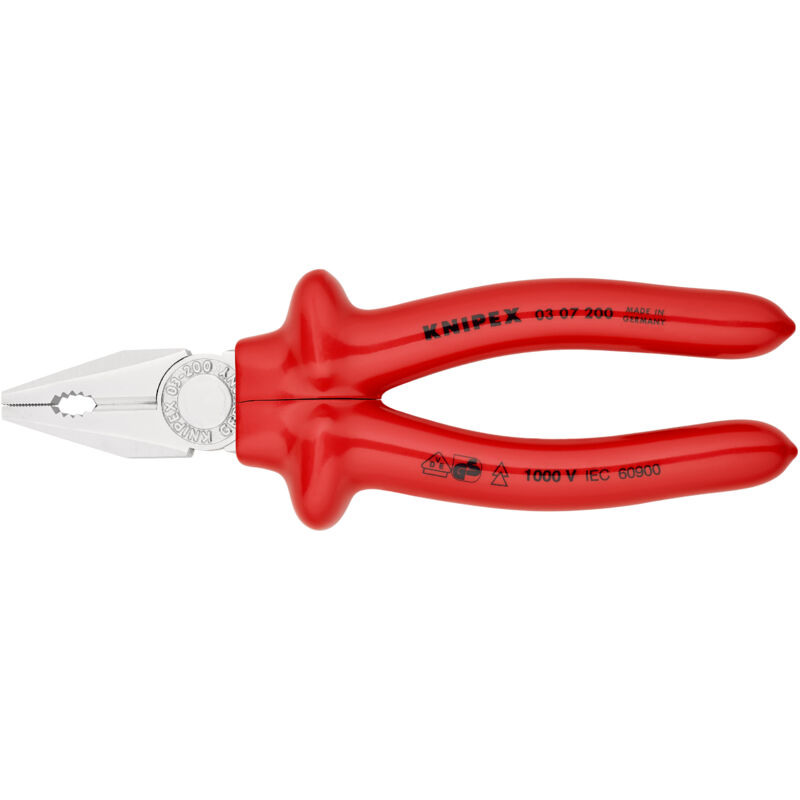 Acciaio speciale per utensili, superfici di presa zigrinate. Isolate a norma DIN EN IEC 60900 / VDE 0682-201 per lavorare sotto tensione fino a 1000 V. Taglienti temprati a induzione (circa 60 HRC). Pinza in esecuzione cromata, manici rivestiti in plastica, isolata. Norma: DIN ISO 5746. Dati tecnici Impugnatura isolati Materiale Acciaio speciale per utensili Antiscintilla no Superficie cromato Tipo di prodotto Pinza multifunzione Lunghezza complessiva, mm 200 Valori di taglio: filo duro fino a ⌀, mm 2,5 Valori di taglio: filo semiduro fino a ⌀, mm 3,8
