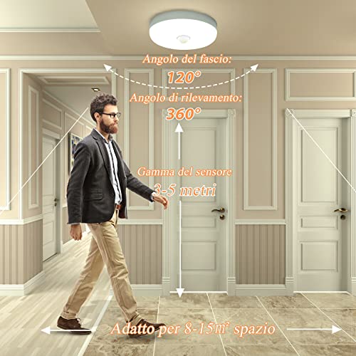 【Sensore di movimento ad alta efficienza】 Campo di rilevamento della plafoniera con sensore di movimento: 5 m, angolo del fascio: 120°. Una volta rilevato un movimento, la plafoniera rimane accesa per 30 secondi e si spegne automaticamente quando non viene rilevato alcun movimento. Quando la persona lascia l'area di rilevamento, la plafoniera con sensore di movimento si spegne automaticamente dopo 30 secondi. Il sensore di movimento a LED ha una durata di oltre 30.000 ore