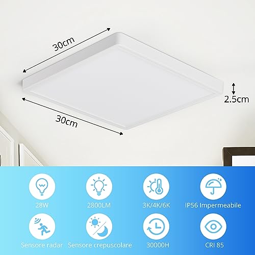 Combuh Plafoniera LED Soffitto con Sensore di Movimento Radar, 28W 2800LM Ø30CM Quadrata Plafoniere con Sensore Crepuscolare, 3000K/4000K/6000K Moderna Lampada da Soffitto per Corridoi Scale Garage