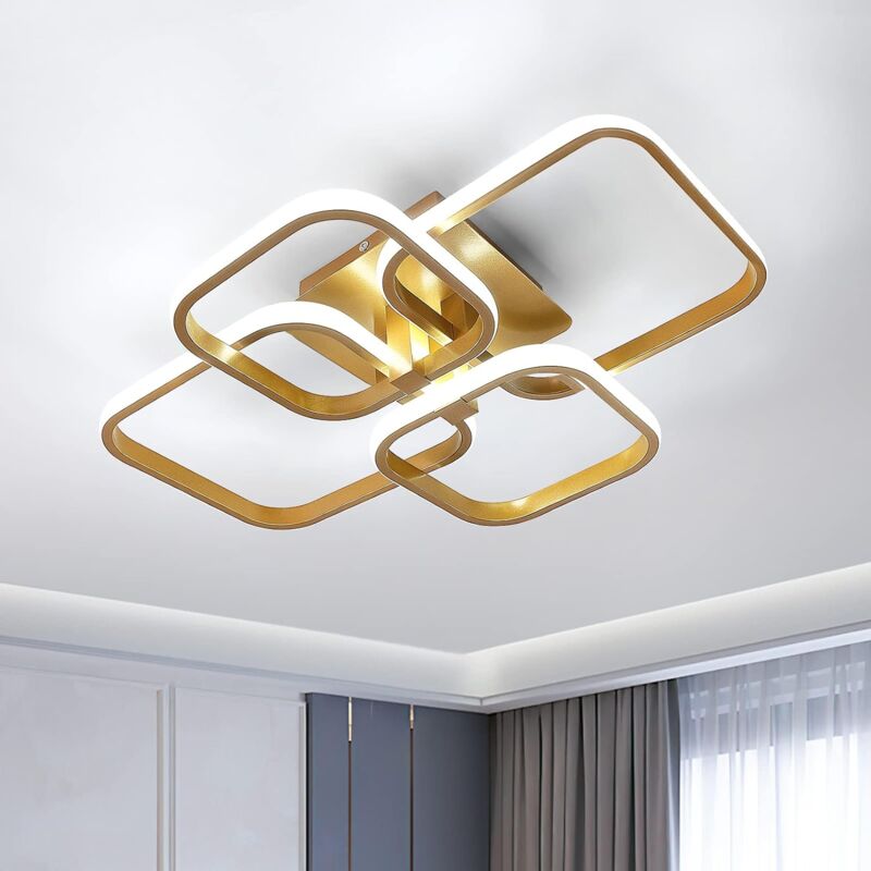 Plafoniera LED dorata da 60W Moderna plafoniera rettangolare a 4 piazze da 6000K, ideale per il soggiorno, la camera da letto o l'ufficio Design creativo: questa elegante plafoniera ha una struttura in metallo a quattro strati e un design unico, moderno e creativo. È perfetta per il soggiorno e la camera da letto e crea un'atmosfera elegante e calda. Aggiunge un tocco moderno ed elegante alla vostra stanza. Protezione degli occhi: il paralume in acrilico di alta qualità fornisce una luce uniforme e priva di sfarfallio e protegge i vostri occhi e quelli dei vostri bambini dall'abbagliamento. Inoltre, l'illuminazione LED integrata è a risparmio energetico e rappresenta una scelta intelligente per l'illuminazione della casa. Facile installazione: le nostre plafoniere sono molto facili da installare. Ogni confezione viene fornita con le istruzioni di installazione e tutti gli accessori necessari. Consultare le istruzioni di installazione e il video per Materiali di alta qualità: La