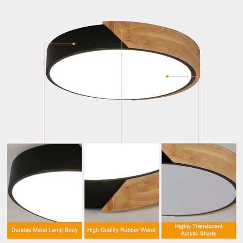 【Design minimalista】La plafoniera a LED ha un design minimalista e rotondo, con una cornice in legno massiccio a metà anello decorata con legno di quercia naturale sano e inodore. La plafoniera nera con accenti in legno ha una forma semplice e bella, che aggiunge un'atmosfera elegante e confortevole ai vostri interni.