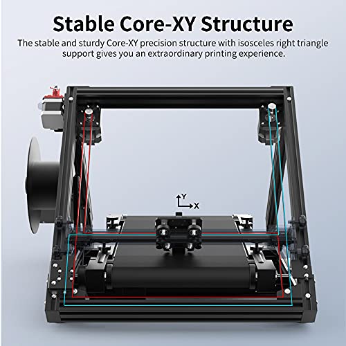 Estrusore in metallo a doppia ingranaggio e struttura robusta Core XY: installato con un estrusore a doppia ingranaggio di alta qualità, combinato con un ugello inclinato di 45 gradi che permette alla stampante di stampare continuamente per lungo tempo. E la struttura di precisione Core XY stabile e robusta con supporto triangolare angolare ad angolo retto offre una straordinaria esperienza di stampa.
