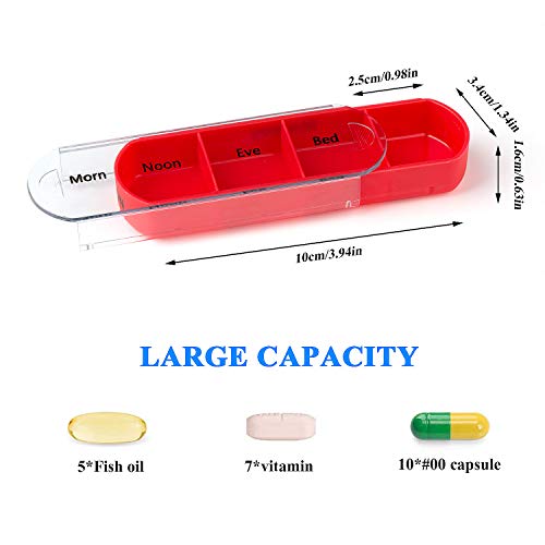 Portatile ma abbastanza grande: dimensioni imballo 13 x 11,5 x 4,5 cm. Un totale di 7 scatole e 28 compartimenti, si può misura 7 vitamine o 10 capsule in ogni vano. Ogni dimensione scatole: 10.5 * 3.5 * 1.5 cm perfetto per la vostra tasca o in borsa senza essere ingombrante.