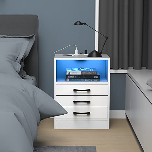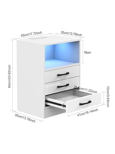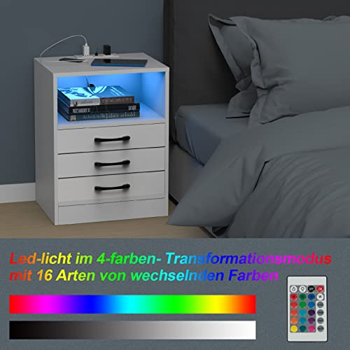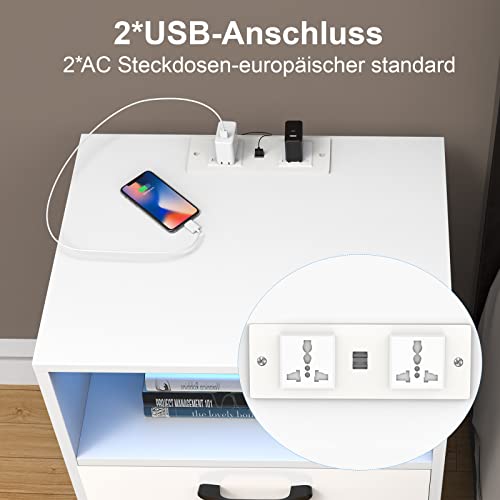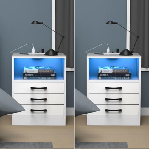 Comodini camera da letto moderni con luce 16 colori LED, Comodini con Stazione di Ricarica, Comodini Camera da Letto con 2 Cassetti e USB,2Pcs 60x45x35cm,Bianco