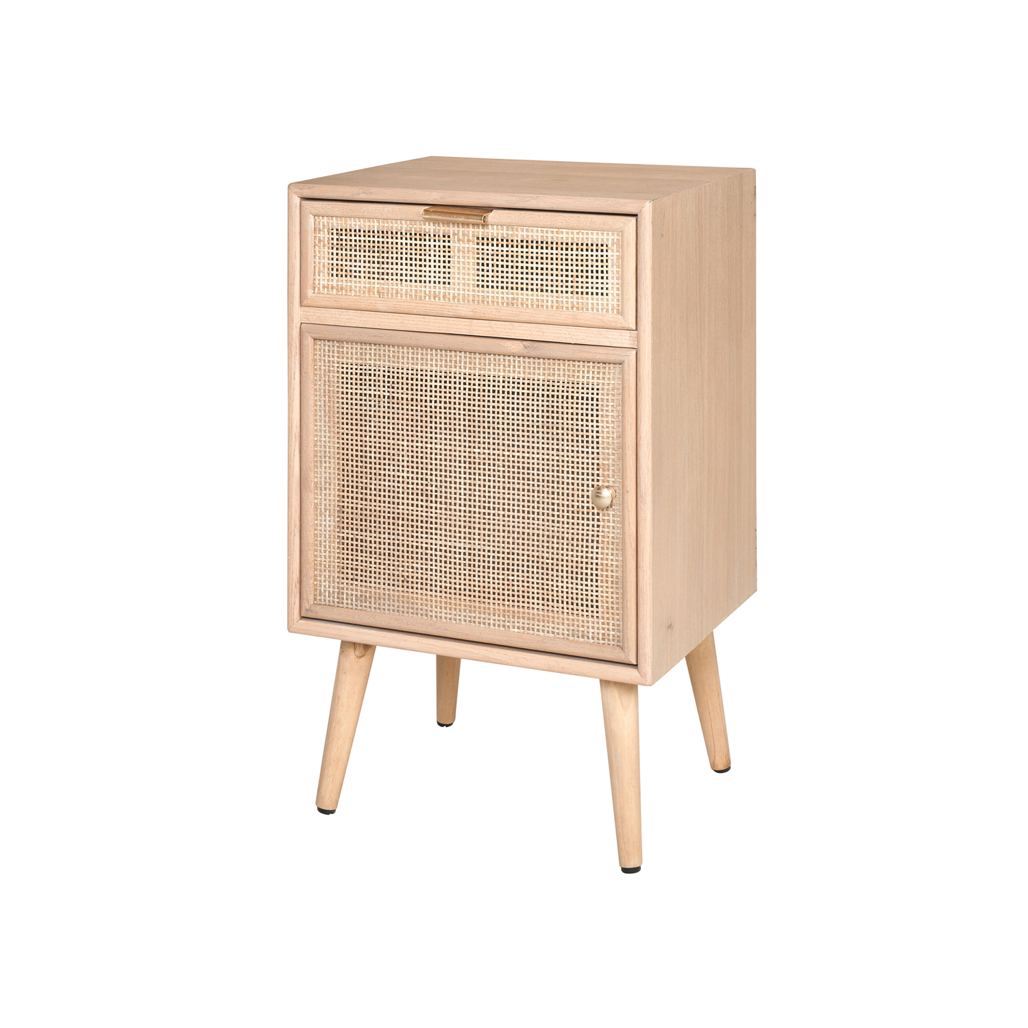 Il comodino della linea Acapulco è un elemento funzionale per completare la tua camera da letto. Il cassettino superiore e lo scomparto ad anta sono ideali per riporre il pigiama e altri accessori da avere a portata di mano quando sei a letto. Catturerà subito l'attenzione con la sua piacevole struttura in legno di frassino e paulonia con frontali in rattan e donerà ai tuoi ambienti interni un tocco naturale. Dimensioni: 42x71x36,5 cm.