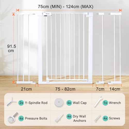 Altezza 91,5cm x Larghezza 124cm - Altezza 91,5 cm. Non dovrete più preoccuparvi che i vostri animali domestici saltino il cancello. Cancellino bambini adatta ad aperture di larghezza compresa tra 75 e 124 cm. Questo cancello sicurezza bambini è perfetto per le scale, le porte, i corridoi e le case. Il cancello pedonale grande 60 cm facilita il passaggio. Nota: misurare le aperture prima dell'acquisto per garantire la corretta applicazione.
