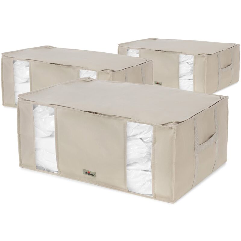 Descrizione Ottimizza lo spazio nell'armadio e proteggi i tuoi indumenti con il set di 3 custodie Dune di Compactor, dotate di sacco sottovuoto integrato. Questi contenitori salvaspazio ti permettono di risparmiare fino al 75% di spazio, offrendoti una soluzione intelligente per capi ingombranti, piumoni, cuscini, trapunte, giacche imbottite e molto altro. Molto semplici da usare: inserisci i tuoi capi lavati e ben piegati, sigilla il sacco con il cursore e apri la valvola universale. Utilizzando un aspirapolvere dotato di tubo flessibile o una pompa manuale per rimuovere l'aria, comprimi il contenuto. Infine, chiudi la valvola di non ritorno, allaccia i cinturini e chiudi la custodia. Pronta per essere conservata nell'armadio, su uno scaffale, sotto il letto, nel letto contenitore e dove preferisci! Non conservare sottovuoto capi non adatti come scarpe, abiti da sposa, tessuti delicati. Realizzate in tessuto non tessuto beige di alta qualità, queste scatole sono rinforzate con un