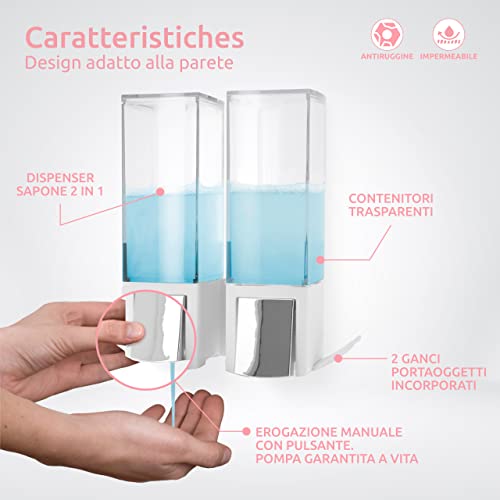 Dispenser per sapone liquido doppio da montare a muro ideale per bagni, cucine, docce e aree comuni, installazione senza dover forare il muro, risparmia spazio sulle superfici vicino al lavandino