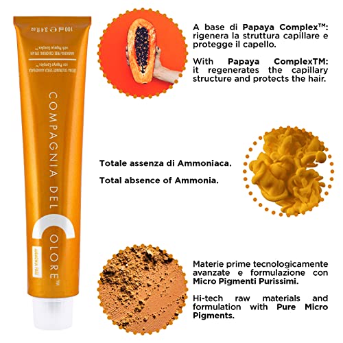 INGREDIENTI: Crema Colorante senza ammoniaca a base di Papaya ComplexTM, il cui elemento principale è la Papaina, dalle molteplici proprietà emollienti, nutritive e condizionanti