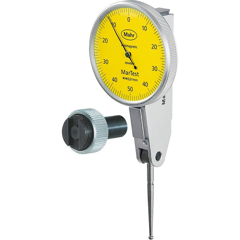 Tastatori a leva di alta precisione con meccanismo montato su rubini in esecuzione robusta e funzionale. Il corpo e i prismi a coda di rondine sono realizzati in un pezzo unico, assicurando la massima rigidità. Protetto contro la corrosione grazie alla cromatura opaca della cassa. Comparatori a leva con asta tastatrice lunga. Lettura 1/100. Mahr − Strumento di misura montato su rubini con sfera di misura in HM. Supporto dell'asta tastatrice in forcella monoblocco, particolare precisione di allineamento;
