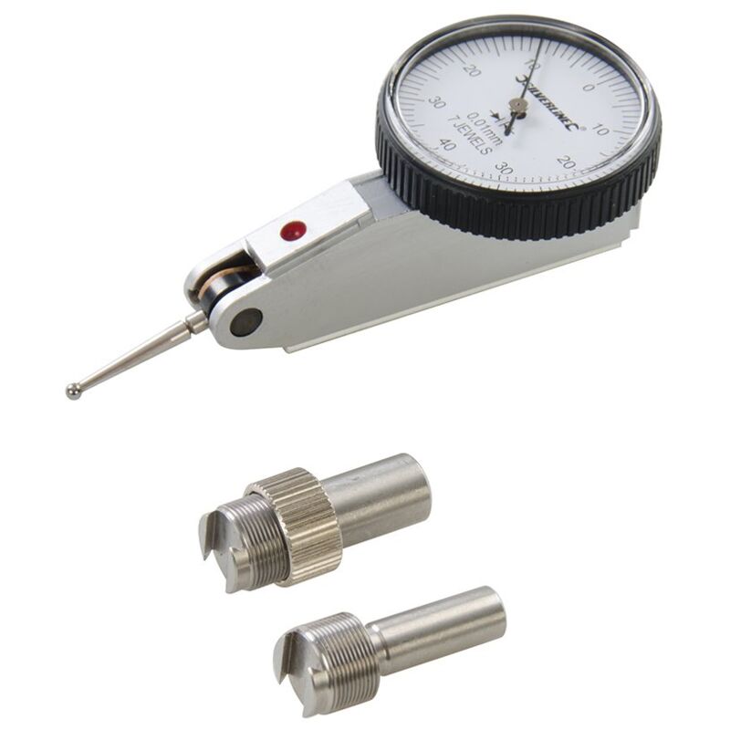 Descrizione Low inertia jewelled bearings and tungsten carbide auto reverse contact point for high sensitivity. Adjustable bezel for zero setting. Range 0 - 0.8mm. Graduation 0.01mm. Scale reads 0 - 40°.