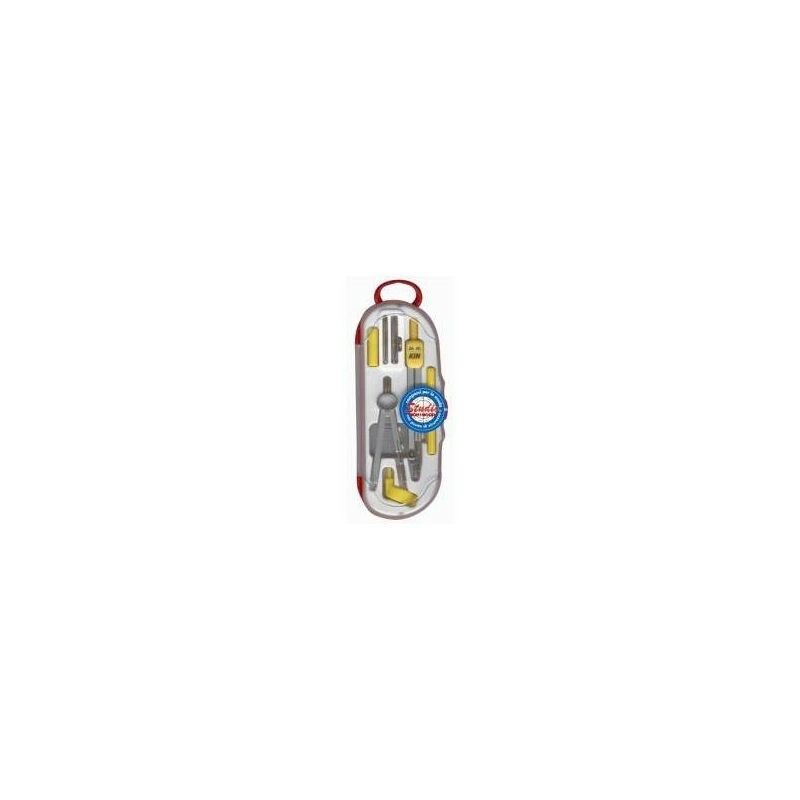 Compasso adatto per uso scolastico. Dotato di aghi di sicurezza. Compasso kit 7 pz contenente: compasso 133 mm. con punta di sicurezza, balustrino con regolazione a vite, innesto, allunga, ricambi e accessori.