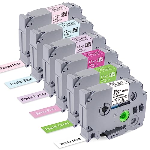 Package -- 6 Roll Compatible for Brother P Touch TZ 12mm Colored Tape, TZe-231 Black on White, TZE-MQG35 White on Pastel Green, TZE-MQP35 White on Berry Pink, TZE-MQF31 Black on Pastel Purple, TZE-MQ531 Black on Pastel Blue, TZE-MQE31 Black on rosa pastello. Dimensioni: rosa pastello. 12 mm x 8 m