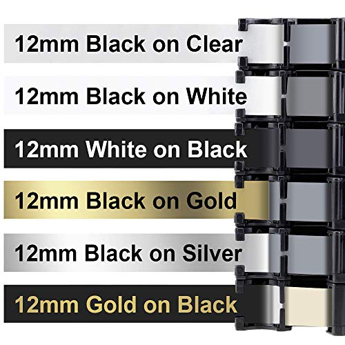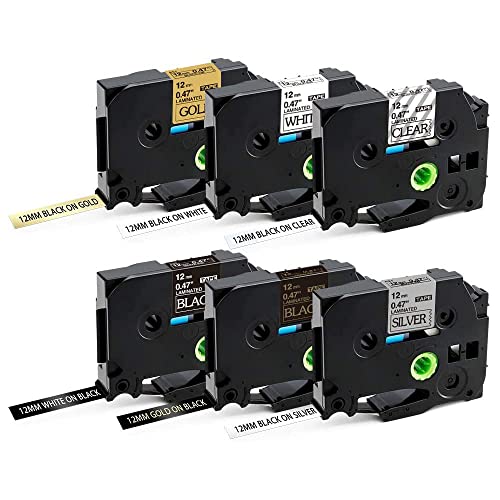 6 x Compatibile Nastro per Brother P-touch TZe 12mm per Etichettatrice Brother Ptouch (Nero su Trasparente, Bianco, Oro, Argento, Bianco su Nero, Oro su Nero)