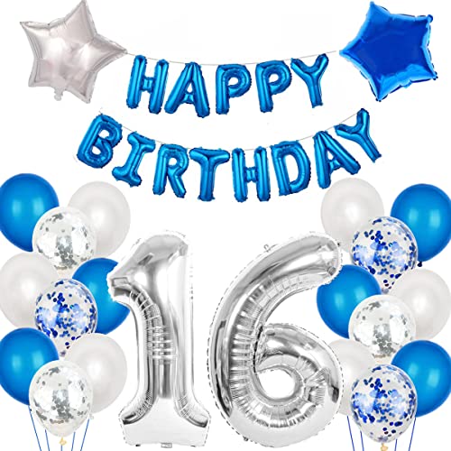Set di decorazioni per il 16° compleanno: 13 bacchette con scritta "Happy Birthday", ghirlanda di palloncini blu, 1 rotolo di nastro decorativo, 6 palloncini in lattice bianco (6 pollici), 3 palloncini trasparenti con coriandoli blu (12 pollici), 1 palloncini blu a stella (18 pollici). 1 x 40 pollici digitale argento "1" palloncini in pellicola, 1 x 40" digitale argento "6" palloncini in lamina argentata, 1 palloncini a stella argentata (18 pollici), 3 palloncini trasparenti con coriandoli