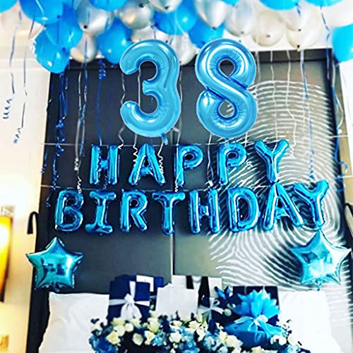 Set di decorazioni per il 38° compleanno: 13 ballerine Happy Birthday, ghirlanda blu, 1 rotolo di nastro decorativo, 6 palloncini in lattice azzurro (12"), 6 palloncini in lattice bianco (12"), 6 palloncini trasparenti con coriandoli blu (12"), 2 palloncini in pellicola a stella blu (18 pollici). 1 palloncino digitale "3" da 32", 1 palloncino digitale "8"
