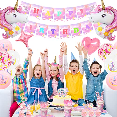 Kit Compleanno Unicorno Bambina, Includere Palloncini Unicorno,Piatti Bicchieri Tovaglioli Cannucce Tovaglia Cerchietto Festone Buon Compleanno Palloncini Party Decorazioni
