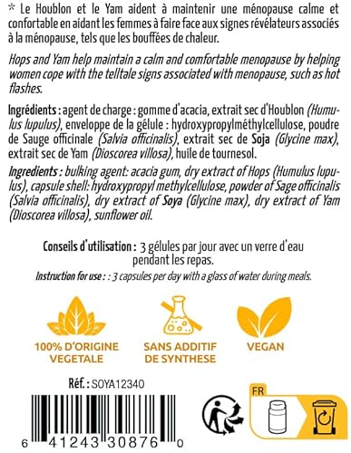 Integratore per la Menopausa 100% naturale, in capsule vegetali, Soia (soja), Yam Dioscorea villosa: Estratto di soia standardizzato al minimo isoflavonne 10% Estratto Yam titolato al 16% di diosgenina, Hop cono, Sage.