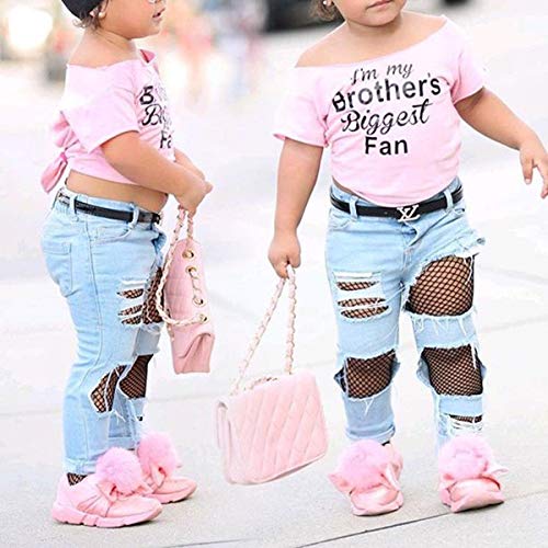 Completi Jeans per Bambina - Top con Volant con Spalle Scoperte Camicia e Jeans Strappati Set di Pantaloni in Denim (4-5 Anni, Rosa-1)