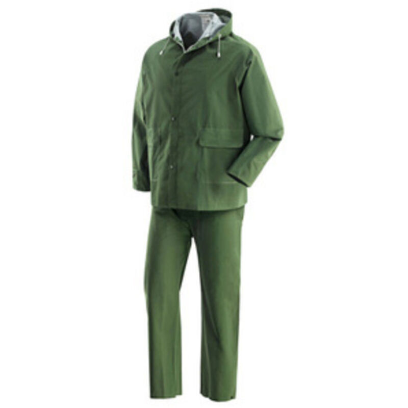In PVC-poliestere-PVC. Peso 390 g/mq Spessore 0,30 mm Chiusura con cerniera e bottoni automatici. Composto da giacca e pantaloni. CE Ia categoria Taglia L Colore verde