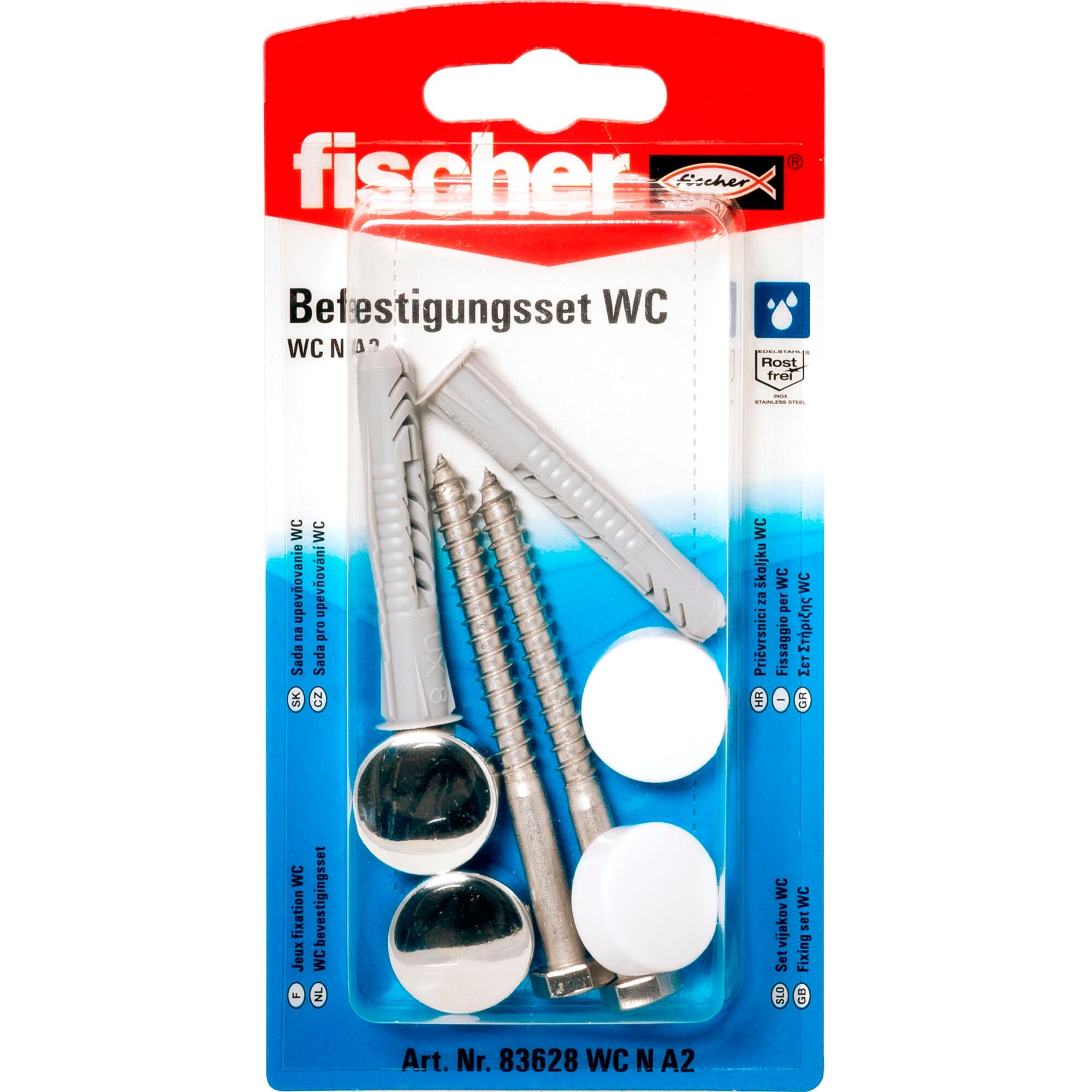 Il set completo di WC N per il fissaggio sicuro di WC stand-alone, bidet, specchi o ripiani in ceramica consente un''installazione facile e veloce. Comprende 2 tasselli universali fischer UX 8 X 50 R in nylon di alta qualità, 2 viti in acciaio inossidabile 6 x 70 con testa esagonale, 2 tappi di copertura e 2 anelli di fissaggio. I dispositivi antirotazione a forma di dente di sega del tassello UX impediscono la rotazione nel foro di trivellazione. In questo modo si ottiene la massima affidabilità di installazione possibile.