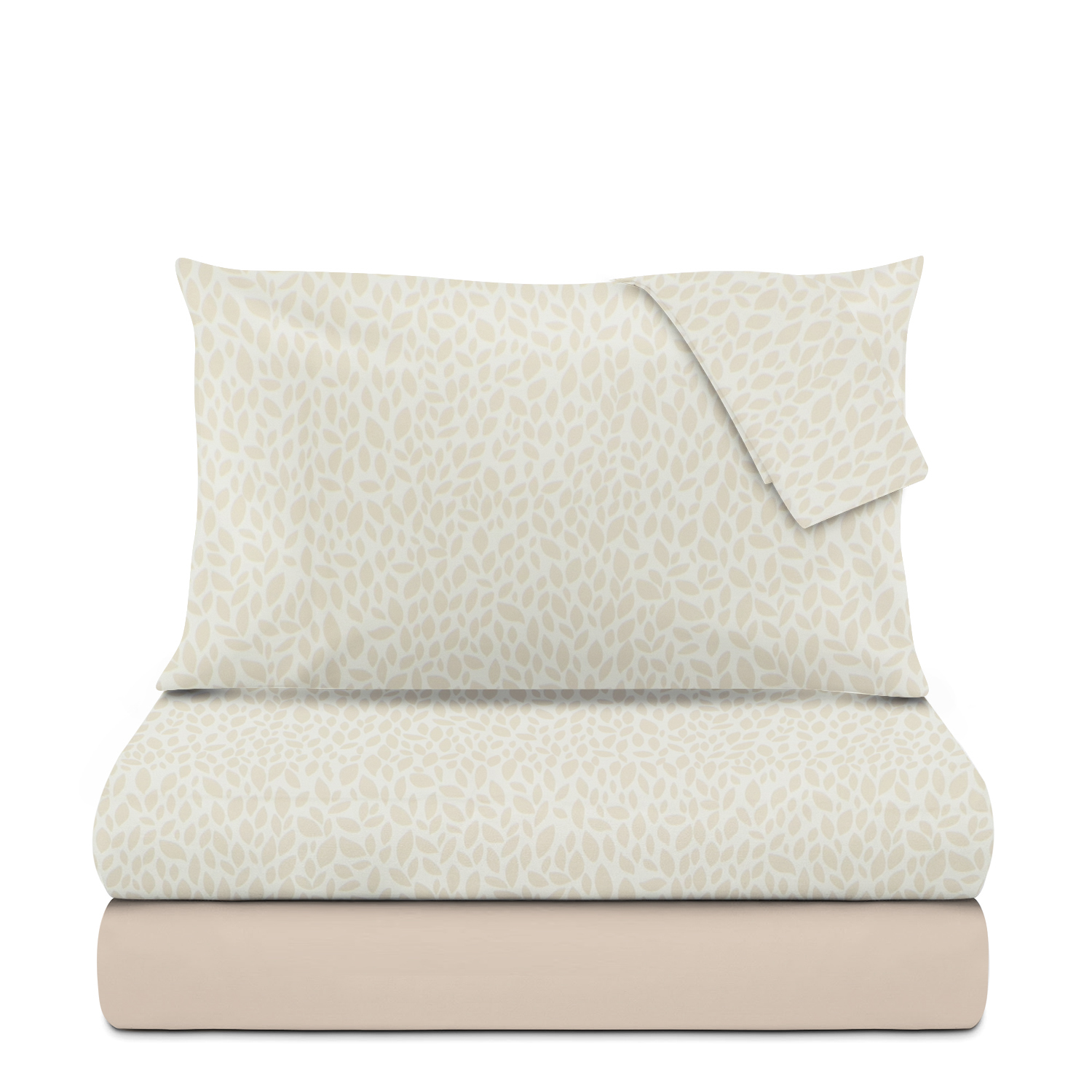 Il completo letto con lenzuola matrimoniali della linea Notte&Natura di Foppapedretti è in cotone percalle Made in Italy, certificato OEKO-TEX Standard 100. Il set si compone di lenzuolo sotto con angoli, lenzuolo piano e 2 federe coordinate. Questo completo è perfetto per portare un tocco di eleganza e raffinatezza nella tua camera da letto matrimoniale. In dettaglio si compone di lenzuolo sopra stampato con decoro di petali color sabbia in coordinato con le federe e si abbina al lenzuolo piano in tinta unita sabbia.