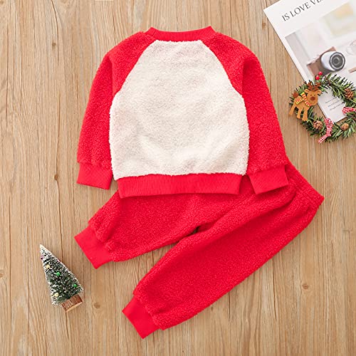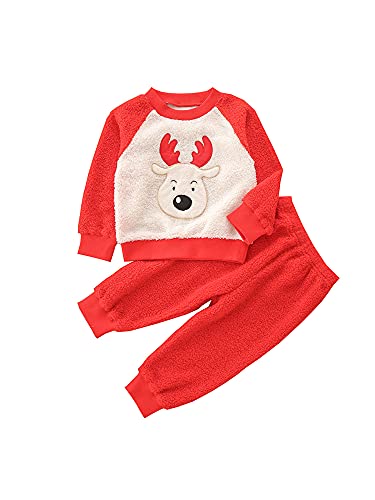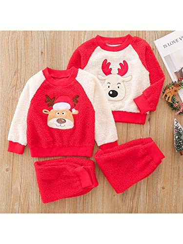 【Design】Completino 2 pezzi, maglietta a maniche lunghe in peluche, pantaloni a vita alta con elastico, con stampa di elementi di Natale, ottimo costume per passare il Natale per i tuoi bimbi. Motivo stampato su maglietta davanti, pantaloni colore solido, non facile da sbiadire. Lavabile in lavatrice a freddo, è adatto per indumenti da notte, abbigliamento domestico, ecc. Il pacchetto include: 1x Felpa + 1x Pantaloni.