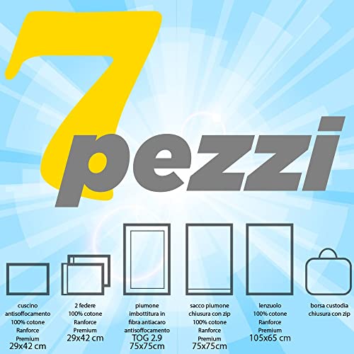 COMPLETO DI TUTTO: il set comprende il cuscino anti-soffocamento in cotone, 2 federe, il soffice e caldo piumone TOG 2.9 con imbottitura in fibra anti-acaro, il sacco porta-piumone con cerniera, il pratico lenzuolino multiuso, la borsa contenitore