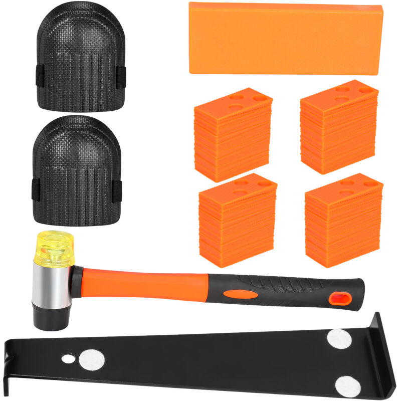 1.Un kit di attrezzi completo: questo kit contiene 1 martello di montaggio (30 cm), 1 blocco di strappo quadrato, 1 gancio di ritorno (30 cm), 1 paio di ginocchiere nere e 40 rondelle. 2.Questo kit di attrezzi professionali vi permette di posare il vostro nuovo pavimento in laminato o legno in modo facile e veloce. 3.Il martello a doppia faccia è dotato di un manico in gomma antiscivolo che assorbe le vibrazioni. La testa del martello rimovibile è in gomma piena su entrambi i lati per una maggiore resistenza e durata. Questo permette un controllo preciso della forza d'impatto. forza applicata. 4.Il blocco del martello e i cuscinetti sono realizzati in plastica PP, inodore e particolarmente resistente. 5.Che siate principianti o professionisti, questo kit di 40 distanziatori per pavimenti in laminato vi permette di installare pavimenti di spessore compreso tra 7 e 15 mm in modo rapido, efficiente e preciso. Specifiche: Colore: arancione Dimensione martello: 30 x 8,8 cm Dimensioni del