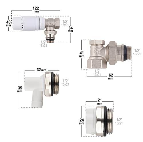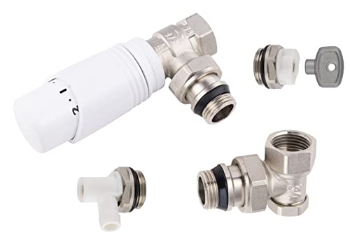 Questo kit comprende 1 rubinetto + testa termostatica + 1 gomito di regolazione + 1 rubinetto di scarico + 1 tappo di spurgo + 1 chiave quadrata di 5