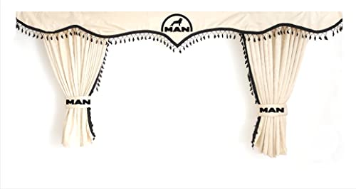 Set completo di tende per camera da letto per camion con pompon e ganci neri con logo MAN BEIGE.