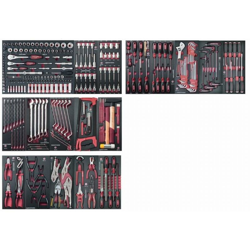 Dettagli: Ampia scelta di utensili da officina, tra cui 308 utensili professionali Incorporati in 18 inserti in schiuma morbida EVA rifiniti in carbonio Chiavi combinate da 5,5 a 22 mm Cricchetti reversibili 1/4+3/8+1/2, 45 denti Bussole 1/4 da 3,5 a 14 mm Bussole 3/8 da 8 a 24 mm Bussole 1/2 da 10 a 32 mm