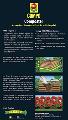 Modalità d'utilizzo: ogni 20 cm di materiale da compostare, pressare leggermente e cospargere circa 200 g di Composter, Ulteriori indicazioni sulla confezione