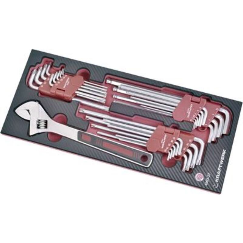 4903-27 Tasto a rulli/penna da 29 parti Impostato in inserto per lo strumento EVA3 completo. Con un set di angoli di testa da 10 parti per una versione extra lunga. Un tasto a matita TX a 9 pezzi set con una testa a sfera su un lato e un tasto a matita TX a 9 pezzi set con un foro interno per viti TX con e senza un perno di sicurezza in una versione extra lunga. Inoltre, una chiave di forcella a rulli industriali regolabili con una maniglia a due componenti fatta di vanadio cromato secondo Din 3117 / ISO 6787 con scala e LED sospeso.