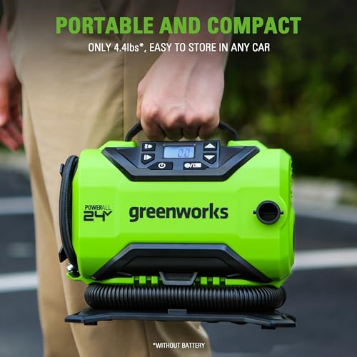 Compressore d'Aria a Batteria Greenworks da 24 V, gonfiatore per Pneumatici per Auto, Pompa ad Aria Max 160 PSI, Pressione preimpostata Manuale, Funzione di spegnimento Automatico