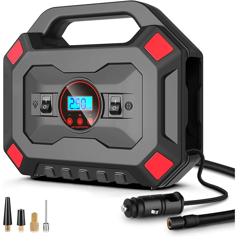 Arresto automatico): devi solo impostare in anticipo la pressione richiesta e puoi utilizzare il compressore d'aria per gonfiare. Quando la pressione dei pneumatici raggiunge il valore preimpostato, la pompa dell'aria si arresta automaticamente. 【Gonfiaggio rapido - La pressione massima del compressore d'aria portatile può raggiungere i 120 PSI. Con un flusso d'aria di 30 l/min, può riempire un pneumatico per auto in 4 minuti. È alimentato da un accendisigari per auto, rendendolo facile gonfiare i pneumatici in caso di emergenza. 【Display digitale】 Il gonfiatore digitale è dotato di un chiaro display LCD, è possibile impostare chiaramente la pressione dell'aria predefinita. È possibile rilevare la pressione attuale dei pneumatici, 4 pressioni dell'aria le unità (PSI, BAR, KPA, KG/CM²) possono essere regolate. L'airbag di gonfiaggio è dotato di illuminazione di emergenza a LED ad alta luminosità, che consente di gestire facilmente gli incidenti di emergenza su strade buie per