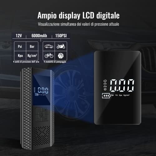 ⚽Display LCD a Cristalli Liquidi e Luce di Emergenza a LED: Il compressore a batteria è dotato di display digitale LCD con valore della pressione del manometro e livello della batteria;