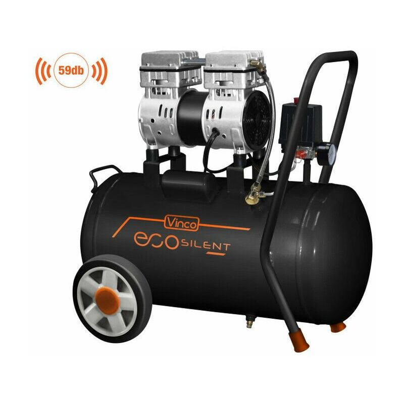 COMPRESSORE ECO SILENT 50 Lt VINCO MOD. 60701 Compressore Vinco da 50 Litri, con ruote maxi e magniglia confortevole. Grazie al doppio appoggio gode di ottima stabilità anche in pendenza. Non necessita di olio. Caratteristiche: Ruote gommate e maniglione extralarge per un facile trasporto Giunti manometro e chiusura rapida per pressione controllata Riduttore di pressione per la regolazione della pressione di esercizio Interruttori automatici a pressione, filtro di aspirazione Valvola di non ritorno, valvola di sicurezza Doppio manometro Specifiche tecniche: Capacità serbatoio: 50 Litri Rumorosità: 59 Db Pressione: 8 Bar Potenza: 1,0 HP / 0.75 Kw Aria aspirata: 180 l/m Tensione/ Voltaggio: 230 V / 50 Hz Giri per minuto: 1440 rpm Dimensioni: 75x36.5x59.5 cm Peso: 23 Kg