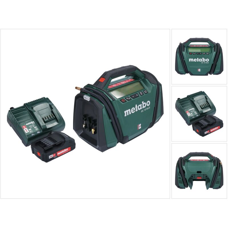 Contenuto della consegna: - 1x Compressore a batteria Metabo AK 18 Multi 18 V - 1x tubo flessibile con 2 adattatori - 1x adattatore universale per alta pressione - 1x adattatore ad alta pressione per valvola di bicicletta - 1x ago a proiettile - 1x cavo auto 12V - 1x batteria Metabo Li-Power Pack 18 V 2,0 Ah - 1x caricatore Metabo SC 30 LiHD Descrizione del prodotto: Il Metabo AK 18 Multi è un compressore a batteria multifunzionale che può essere utilizzato in modo versatile per gonfiare pneumatici, palloni, materassi ad aria e molto altro. La funzione di alta pressione consente di gonfiare facilmente pneumatici di auto e biciclette. La funzione volume del compressore consente inoltre di gonfiare e sgonfiare rapidamente prodotti gonfiabili come letti per ospiti, materassi ad aria e accessori per piscine. Un ampio display ad alto contrasto mostra la funzione selezionata, la pressione corrente e la pressione target impostata. La pressione può essere visualizzata in bar, psi e kPa. Non